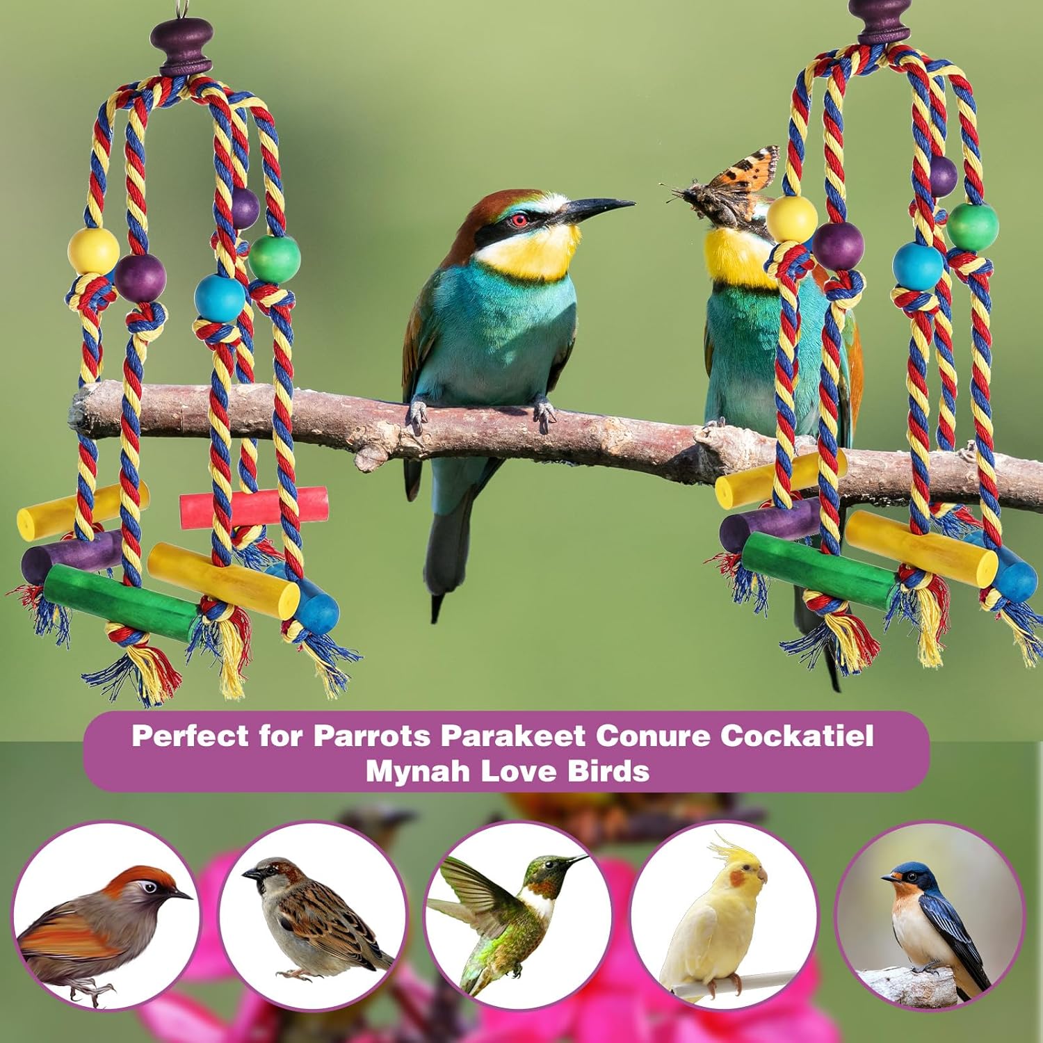 Bird Toys for Parrots Conures, Colorful Rope Bird Toys, Interactive Chewing Climbing Toy for Cockatiels, Small Birds Fun Hanging Design with Hook for Cages Relieves Boredom Encourages Behavior