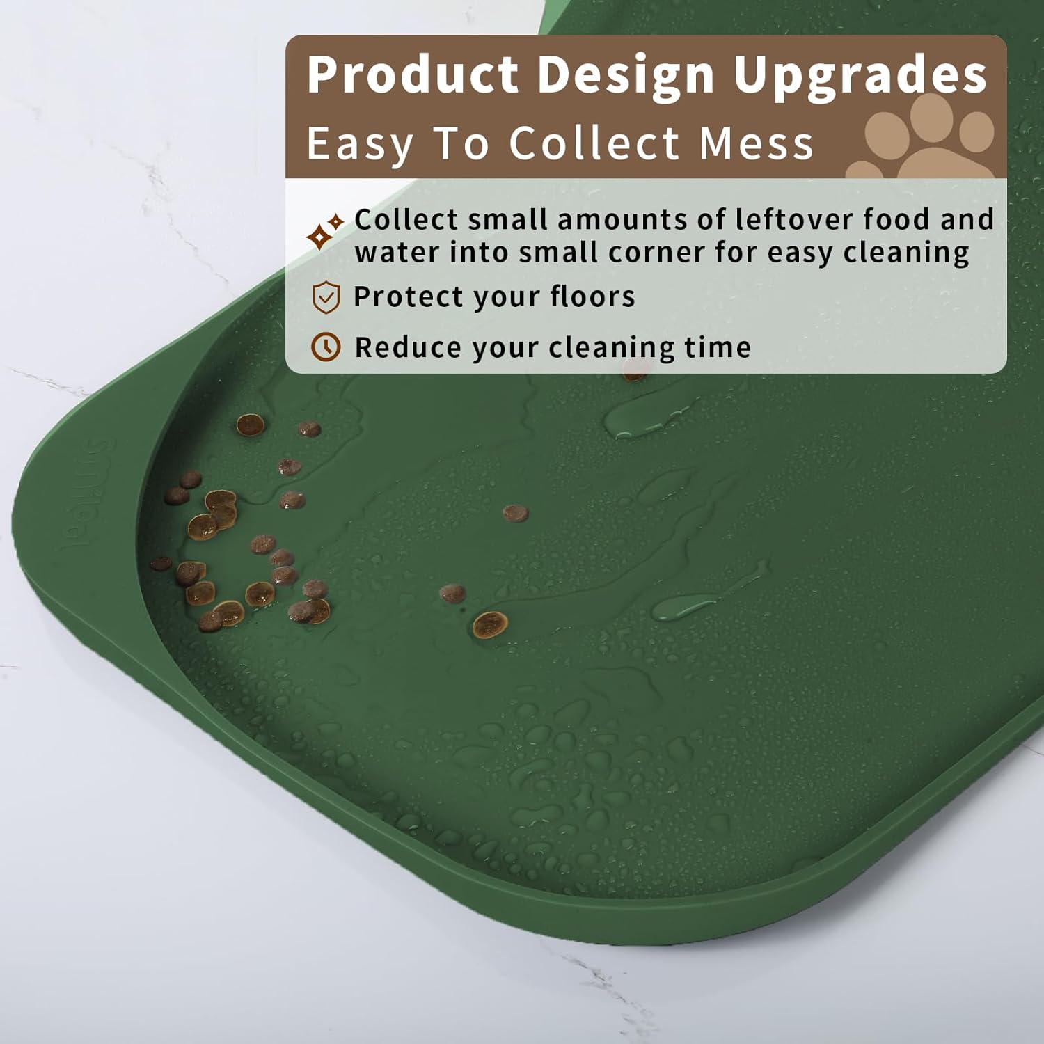 Silicone Pet Feeding Mat with Raised Edge & Residue Collection Pocket for Food and Water, Dog Bowl Mats, Cat Bowls Placemat with High Lip for Floor Waterproof, 22 x 14 x 0.8 Dark Olive