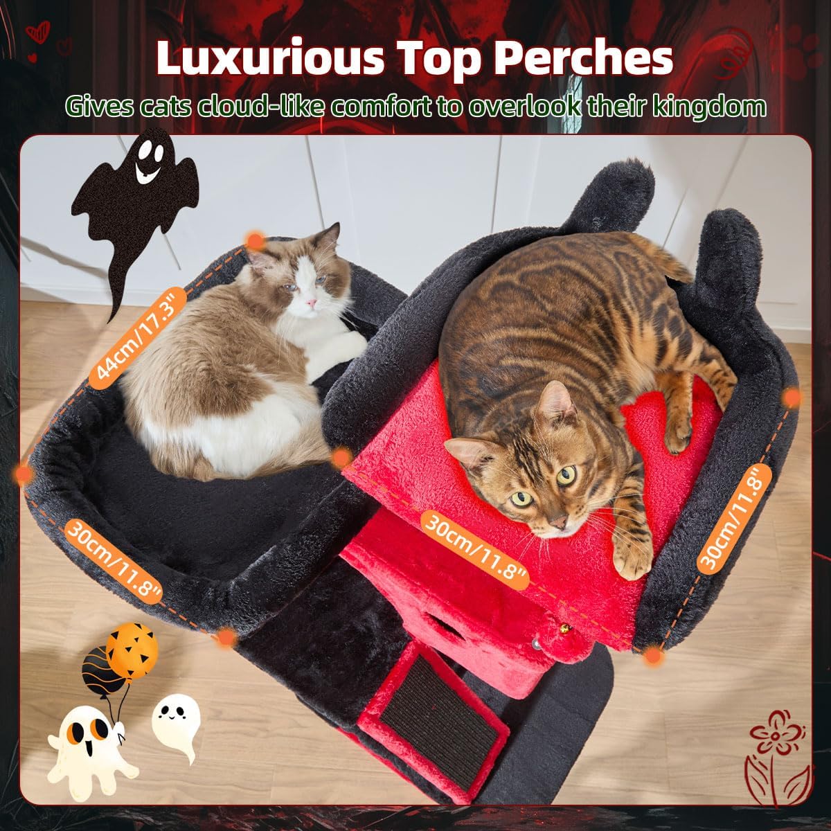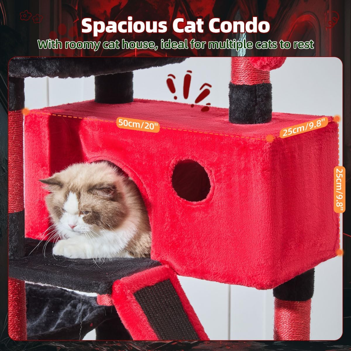 Taoqimiao Gothic Cat Tree 57.5-Inch, Cat Tower for Indoor Cats Large Adult, Large Cat Condo, 8 Sisal Scratching Posts, Metal Frame Cozy Hammock, Durable Scratch Board, 2 Perches, Black and Red MS026BR