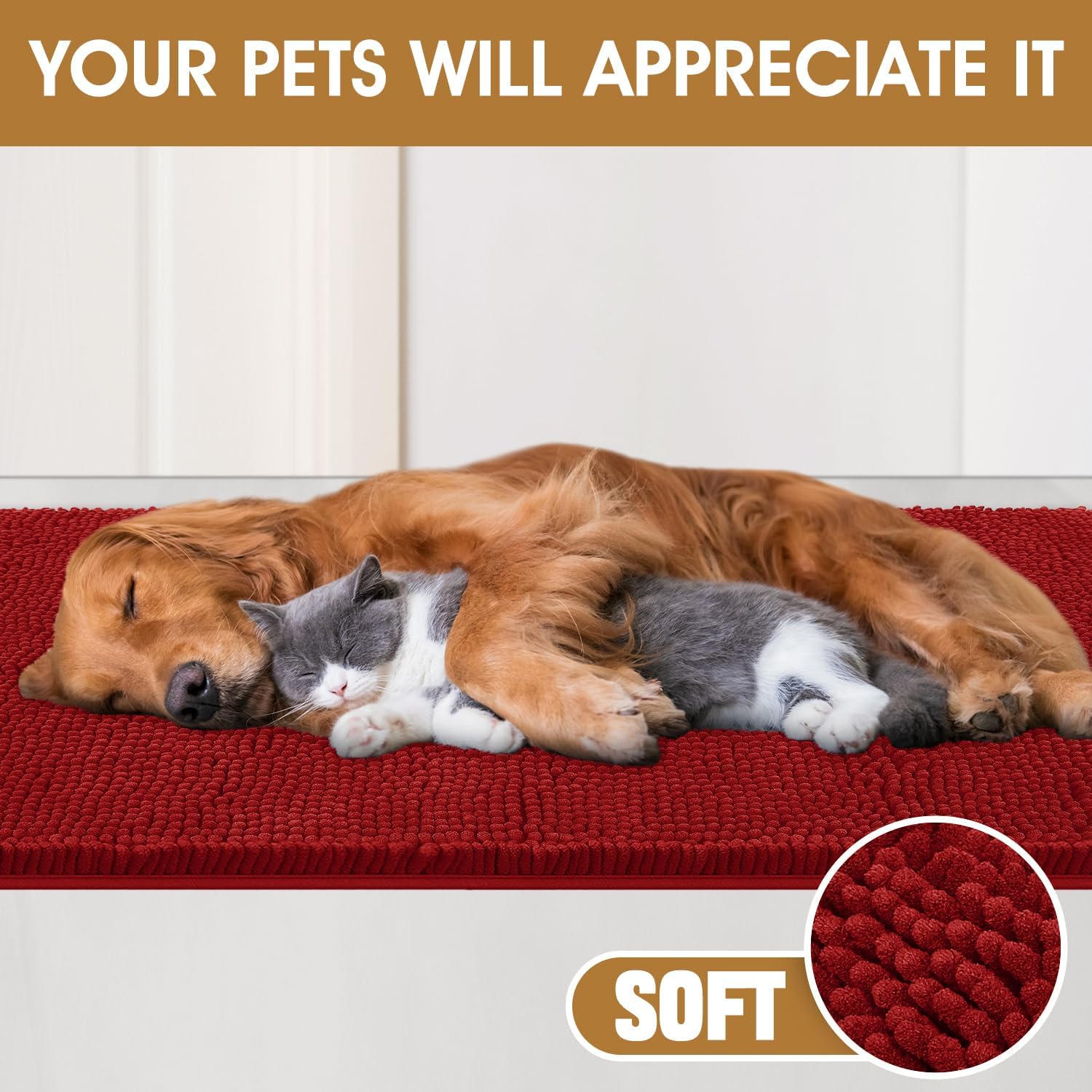 Dog Door Mats for Muddy Paws, Chenille Absorbent Door Mats, Non Slip Heavy Mud Mat for Dogs, Soft Indoor Door Mat for Entryway, Mud Paws, Inside Floor,36" X 24", Red