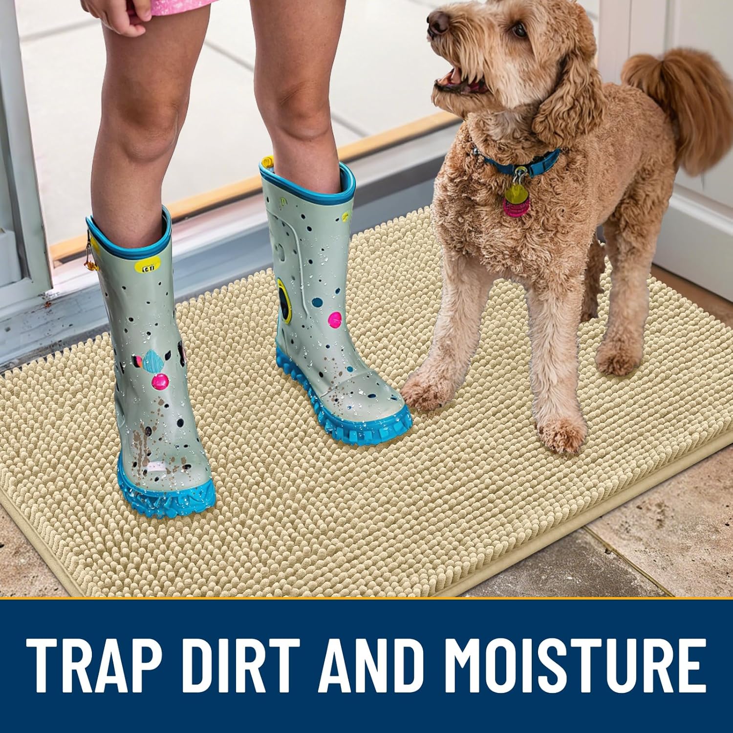 - [Absorbent and Dirt Trapper] High-density chenille dog mat, super absorbent and dirt-catching, whether wet after shower, muddy or moisture bring back by dogs, it can absorb well, so that you and your favorite pet can say goodbye to the wet and mud. It's an excellent choice for use as an entryway door mat, a welcome door mat or a dirt-trapping door mat.