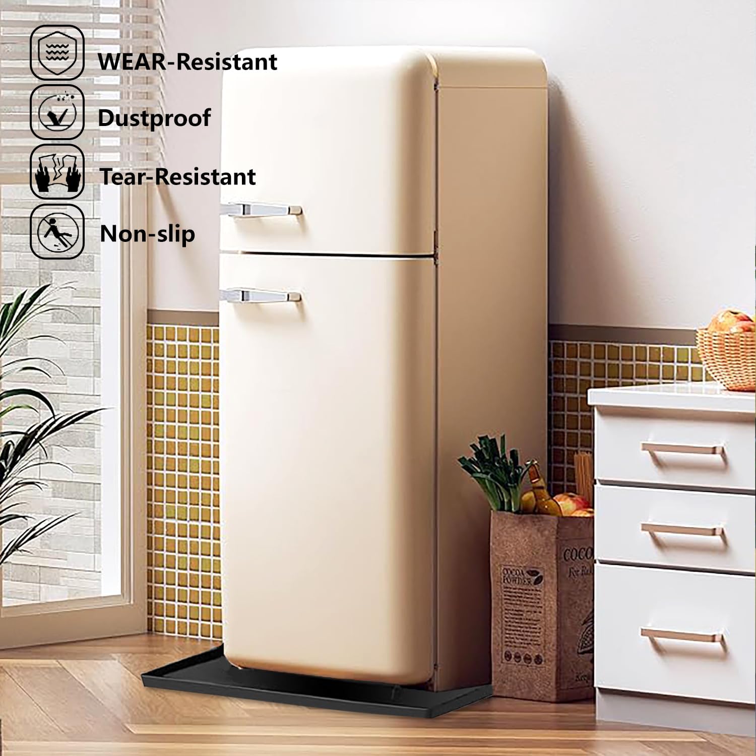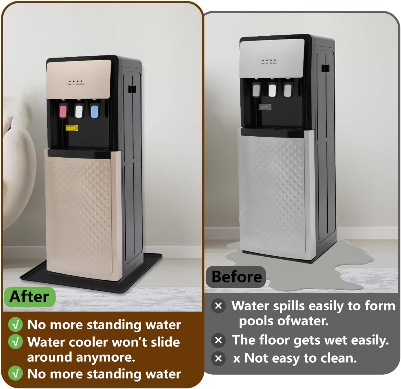 - 【Anti-slip Design】The back layer of the water cooler dispenser mat is anti-slip and waterproof enough. The refrigerator mat not only prevents water from flowing on the floor, but also prevents the mat from moving while also reducing vibration and noise, making it highly practical