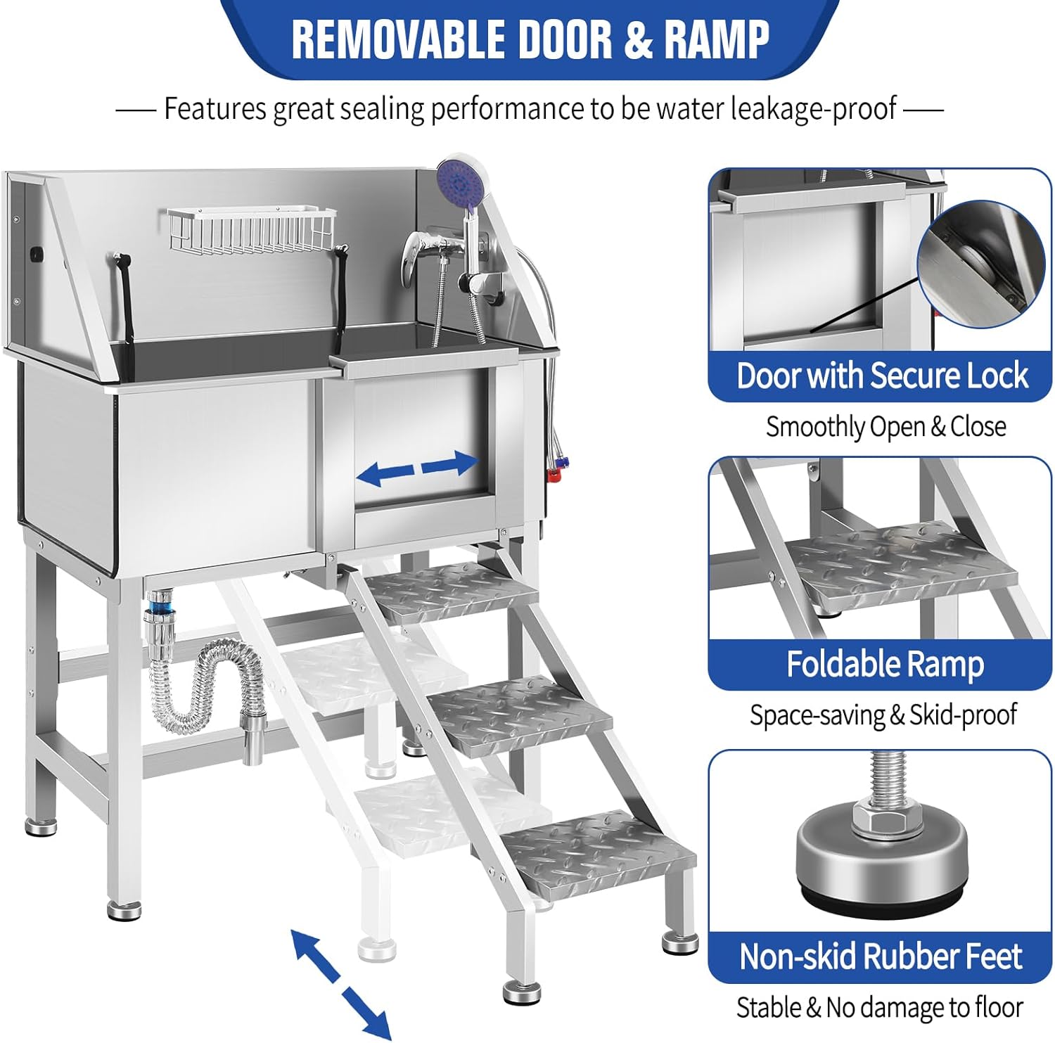 - 2. Safe & Anti-Slip Construction:The upgraded sealing system prevents leaks, while anti-slip stairs with limit holes ensure stability. Pets enter and exit safely—no wobbling or slipping during bath time.