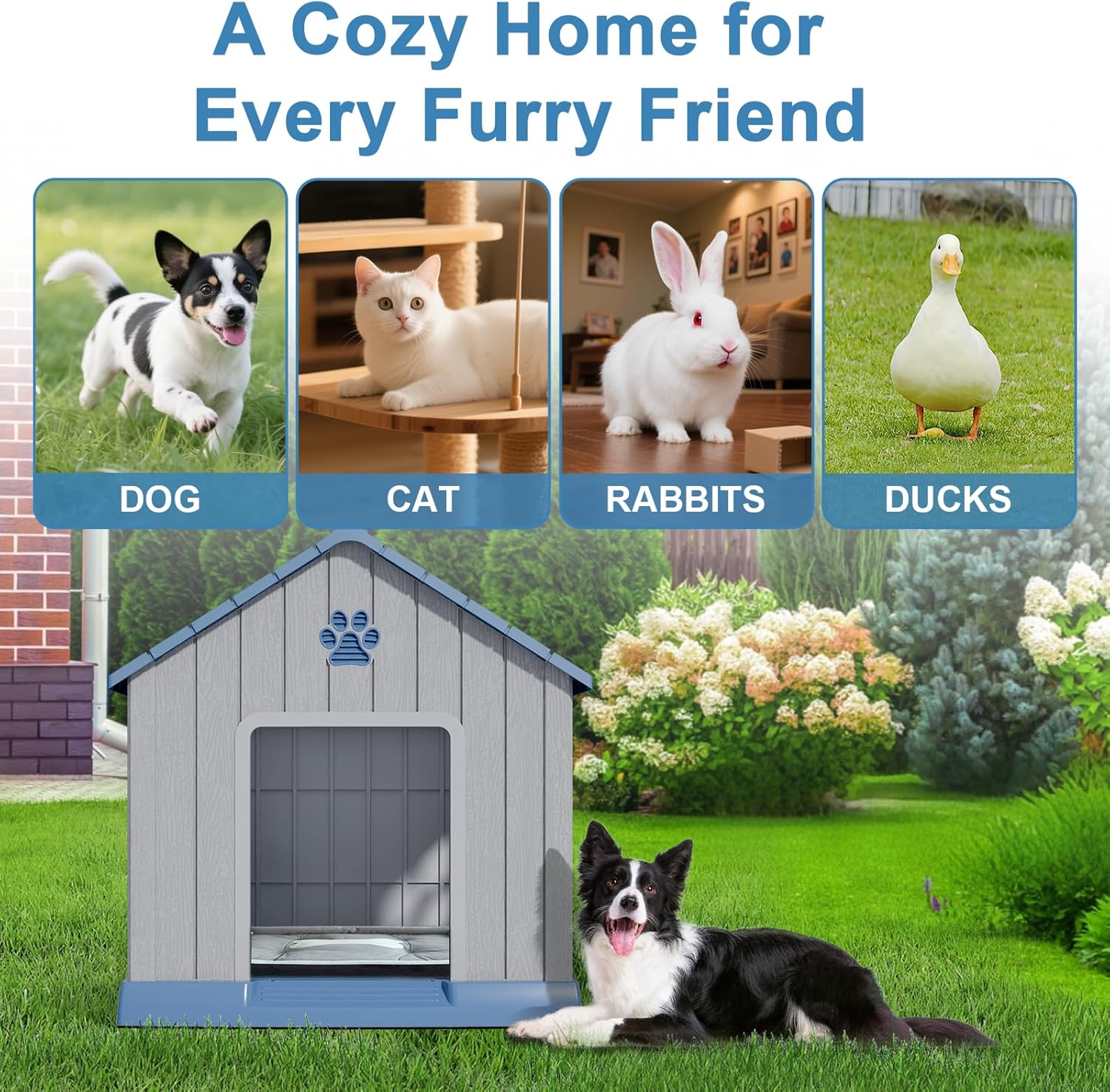 Dog House Indoor Outdoor for Small to Large Sized Dogs Resin Outdoor Dog House with Ventilation Puppy Shelter with Elevated Floor, Easy to Assemble, Blue