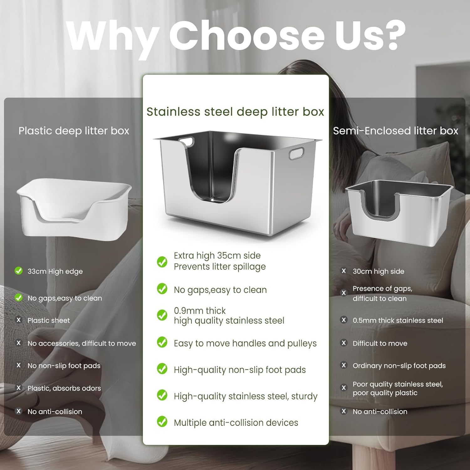 - No Assembly Required: Our high-sided XXL stainless steel cat litter box comes ready to use with no assembly needed, saving you time and effort. The litter box top-entry design offers added convenience. If you have any questions, feel free to contact us, and we'll respond within 24 hours.
