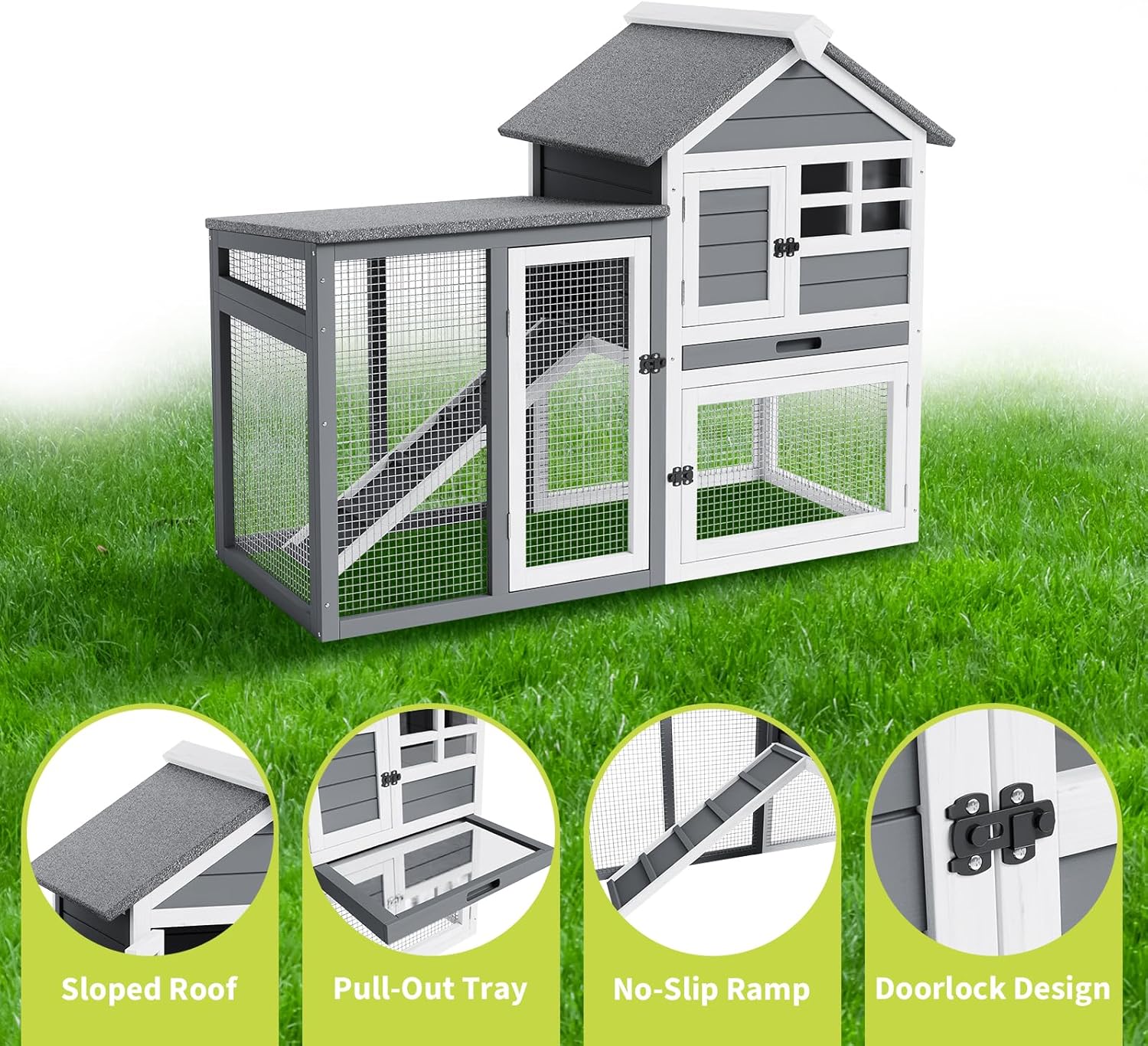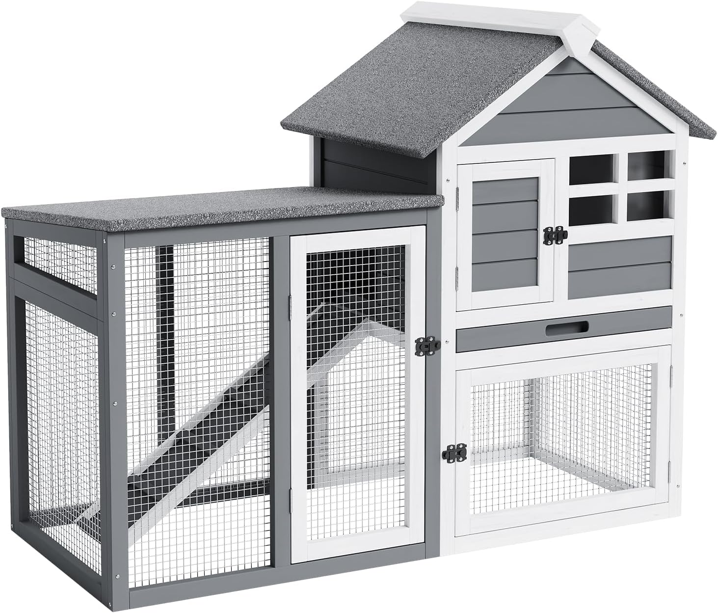 - 5. Animal-Friendly Design for Comfort & Safety: Every detail prioritizes pet welfare: textured non-slip ramps prevent falls, rounded corners reduce injury risks, and high ceilings support natural movement. The reinforced wooden frame withstands chewing, making this indoor/outdoor pet cage a lasting habitat.