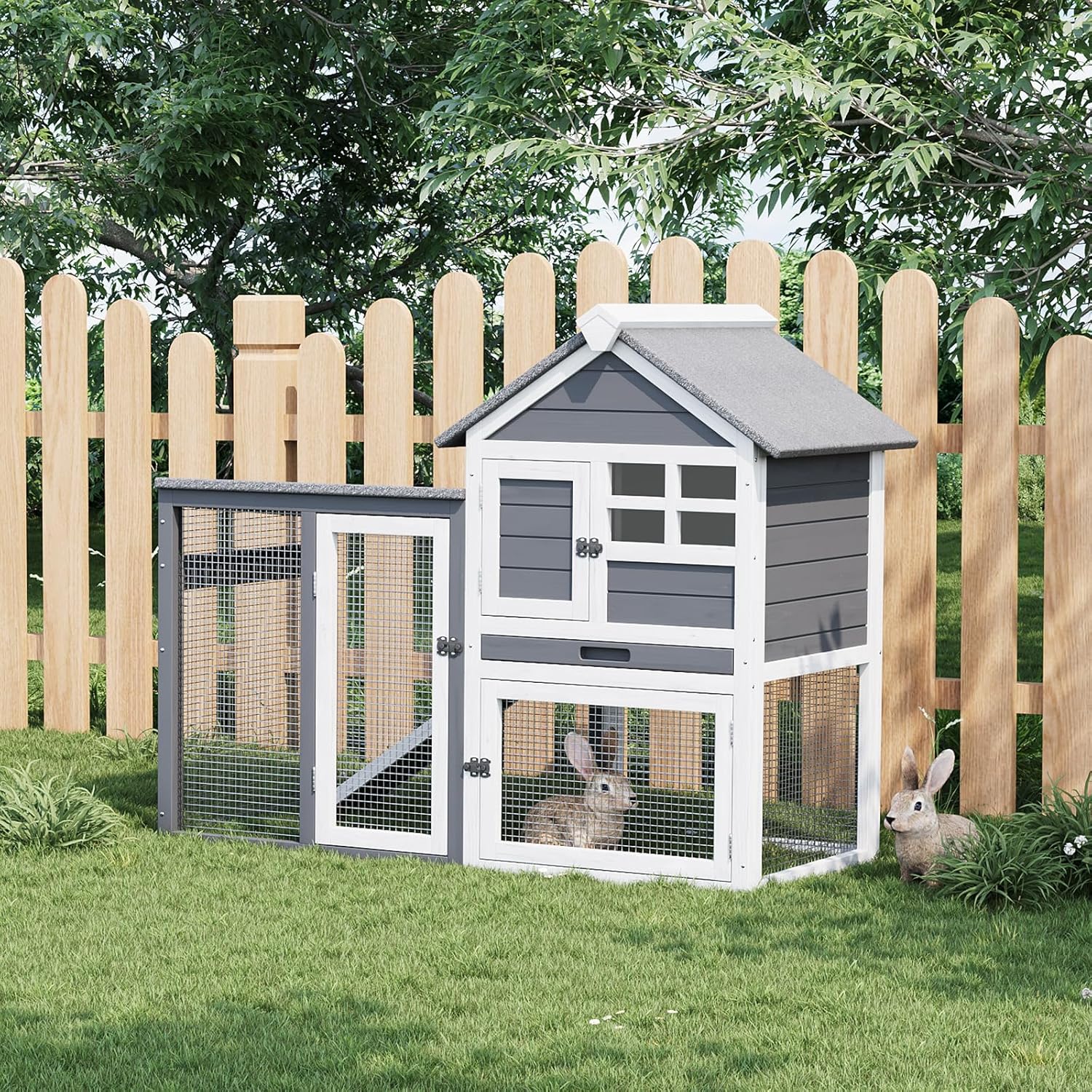 - 1. Spacious 2-Tier Rabbit & Chicken Cage: This dual-level rabbit hutch provides separated living zones: a sunny ground run for exercise and a waterproof elevated sleeping area. The tiered design offers ample space for rabbits, guinea pigs, or chickens to play and rest, while the viewing window allows easy monitoring of your pets.