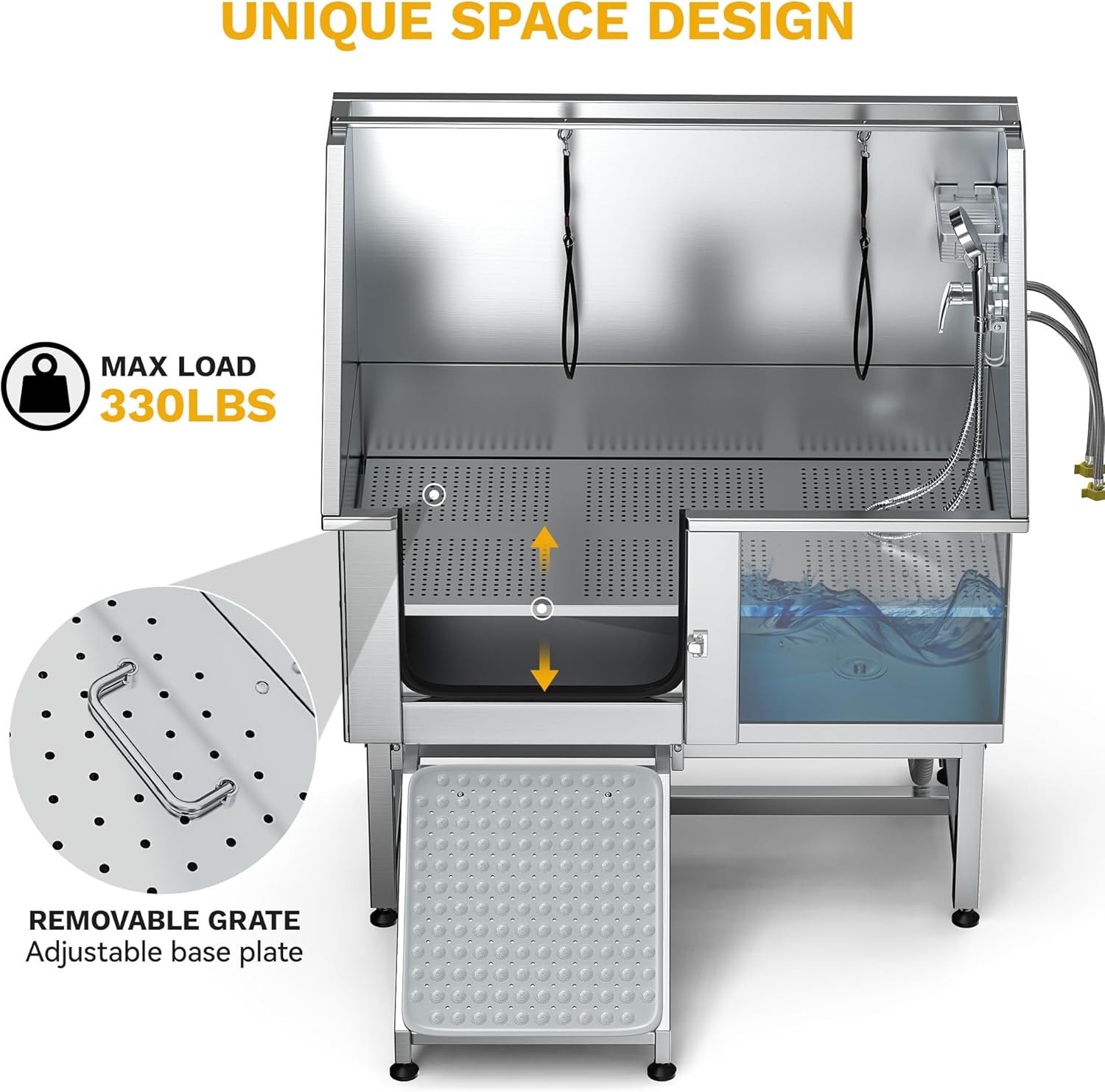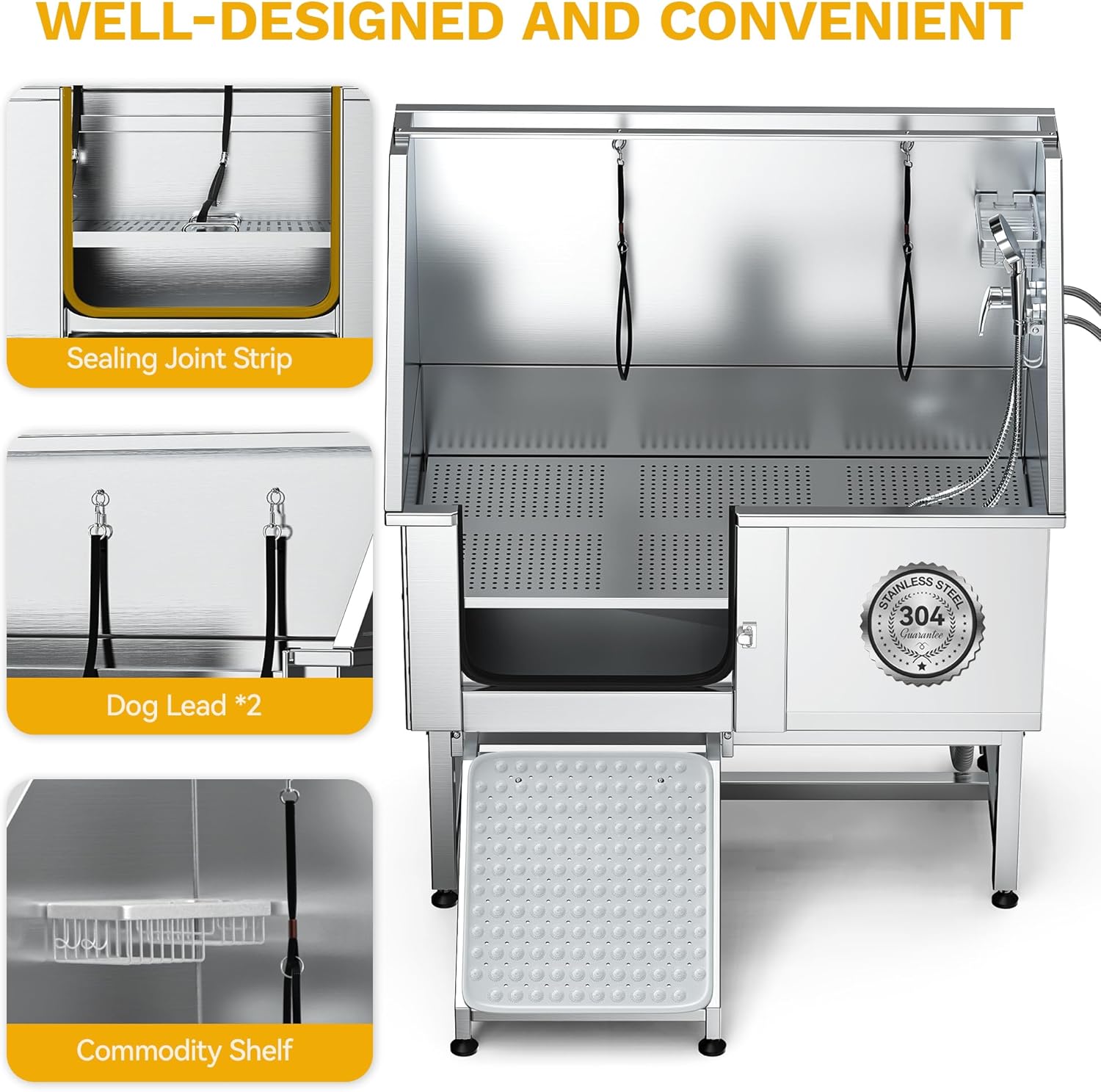 - Durable 304 Stainless Steel Tub Body: With a 330 lb weight capacity, this pet bathtub is built for long-lasting use; The fully welded, one-piece design prevents leaks, while the smooth surface allows for easy cleaning and maintenance