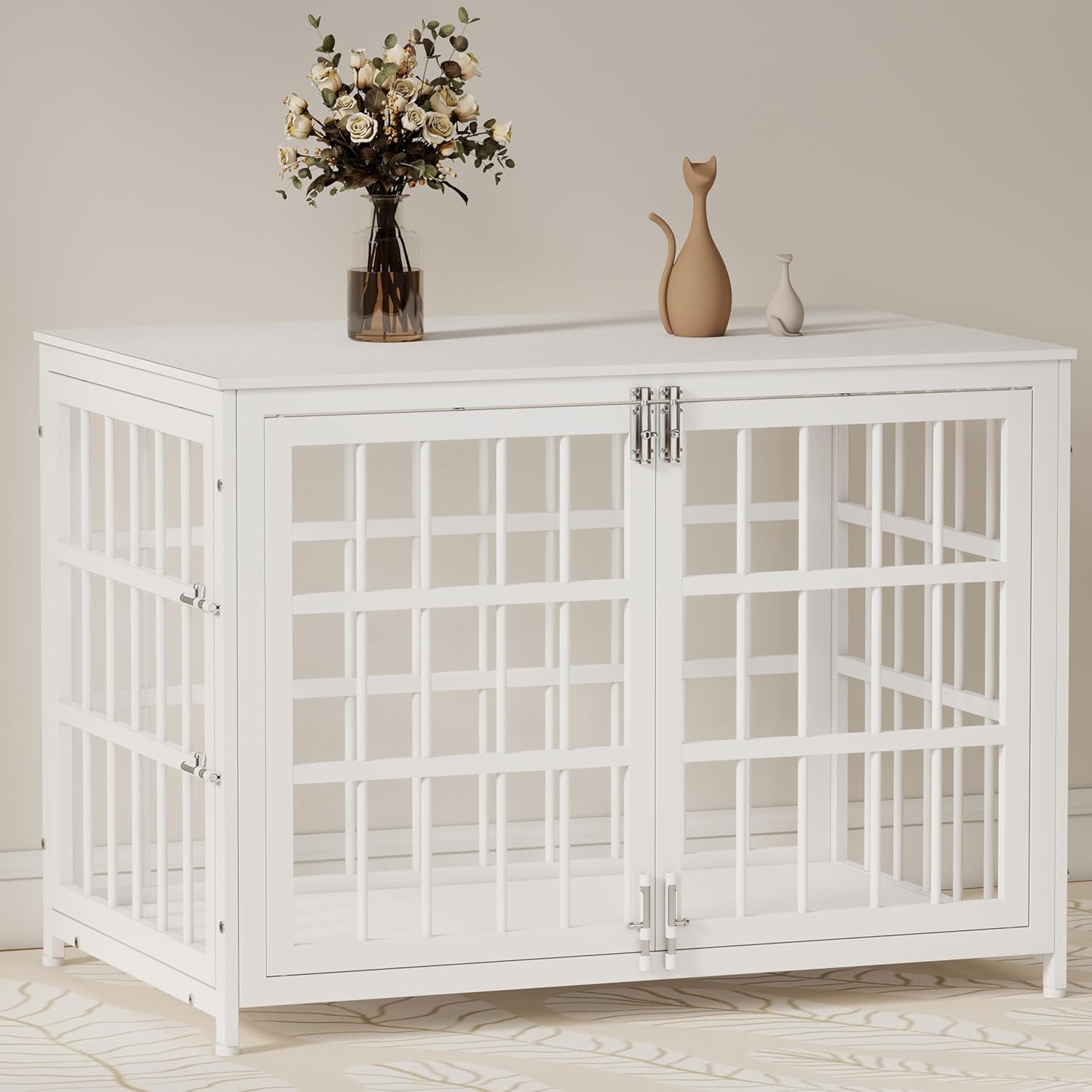 38 Inch Heavy Duty Wooden Dog Kennel End Table with Double Door Design and Secure Locks, Indoor Pet Crate Furniture for Medium Dogs, Decorative Home Cage Design,White