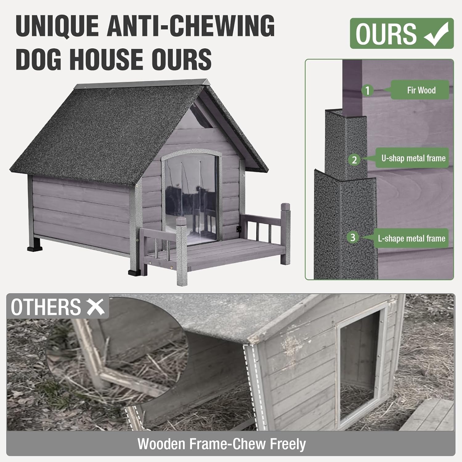 - Sturdy and Durable Structure: The dog house is made of solid wood and metal frame construction, ensuring its sturdiness and durability. The U-shaped and L-shaped metal frame design prevents the dog house from being chewed, offering additional protection and stability. Compared to other wooden frames, our dog house is more durable.