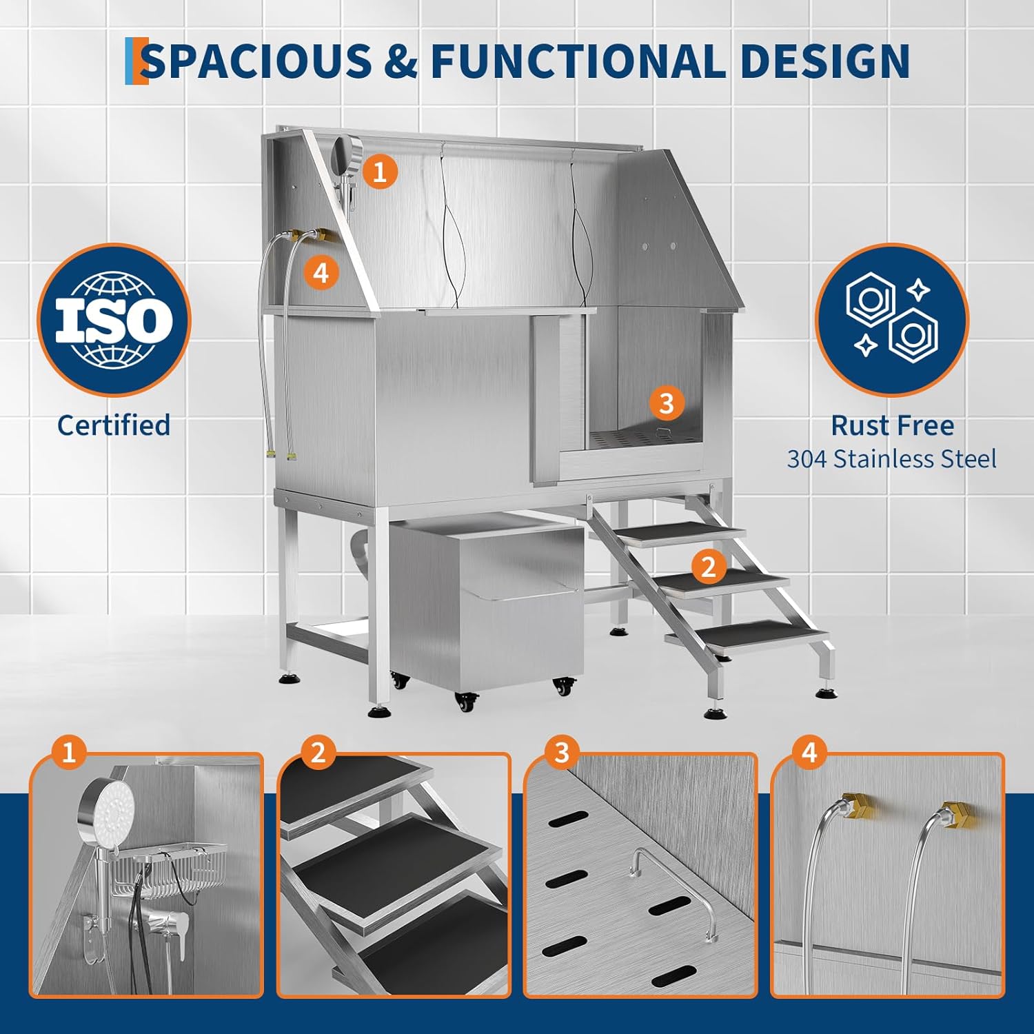 • Efficient Drainage System Removable floor grate prevents water accumulation and simplifies post-bath cleanup. Maintains tidy workspace during grooming sessions.