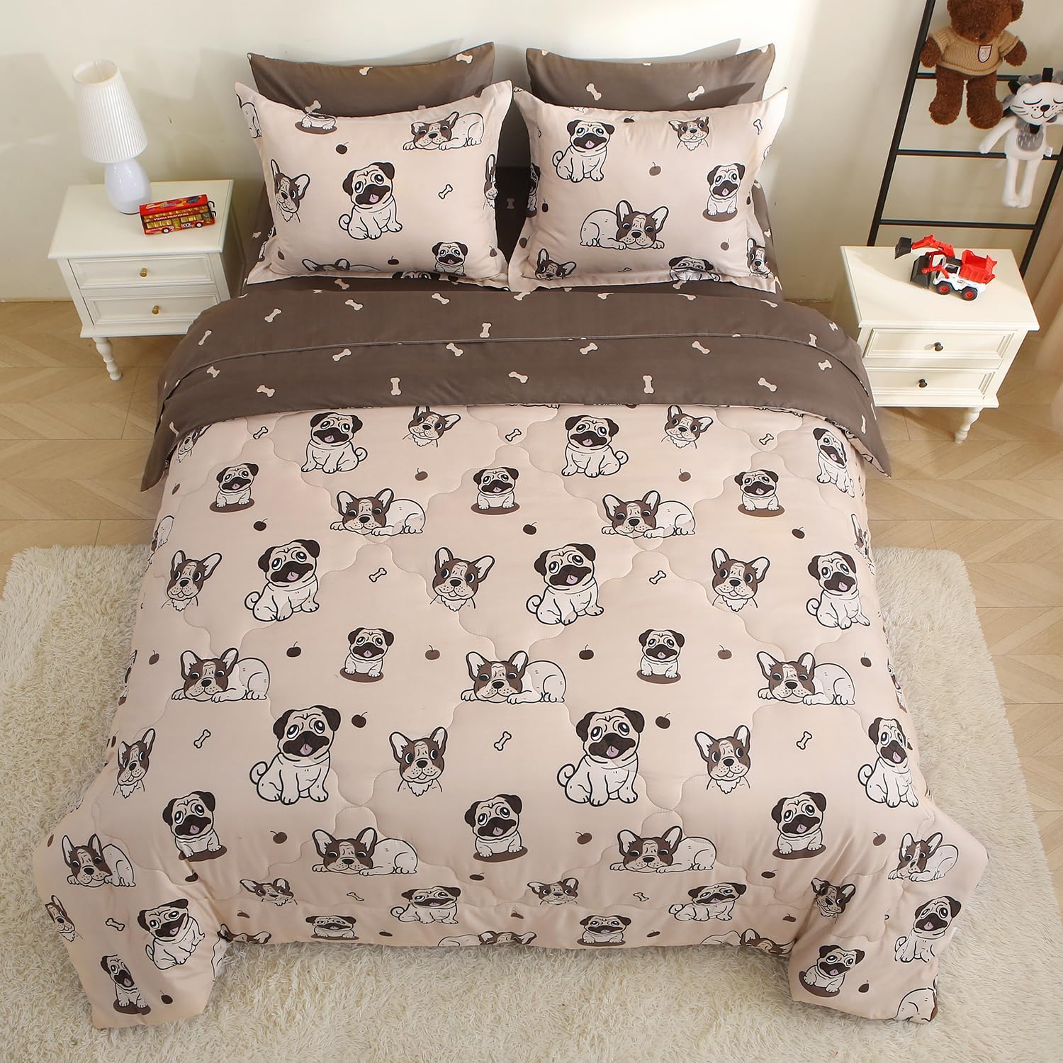 Kids Comforter Set 7 Piece Bedding Cute Dog Cartoon Animal Bed Microfiber Comforter Queen Size All Season (1 Comforter, 1 Flat Sheet, 1 Fitted Sheet, 4 Pillowcase)