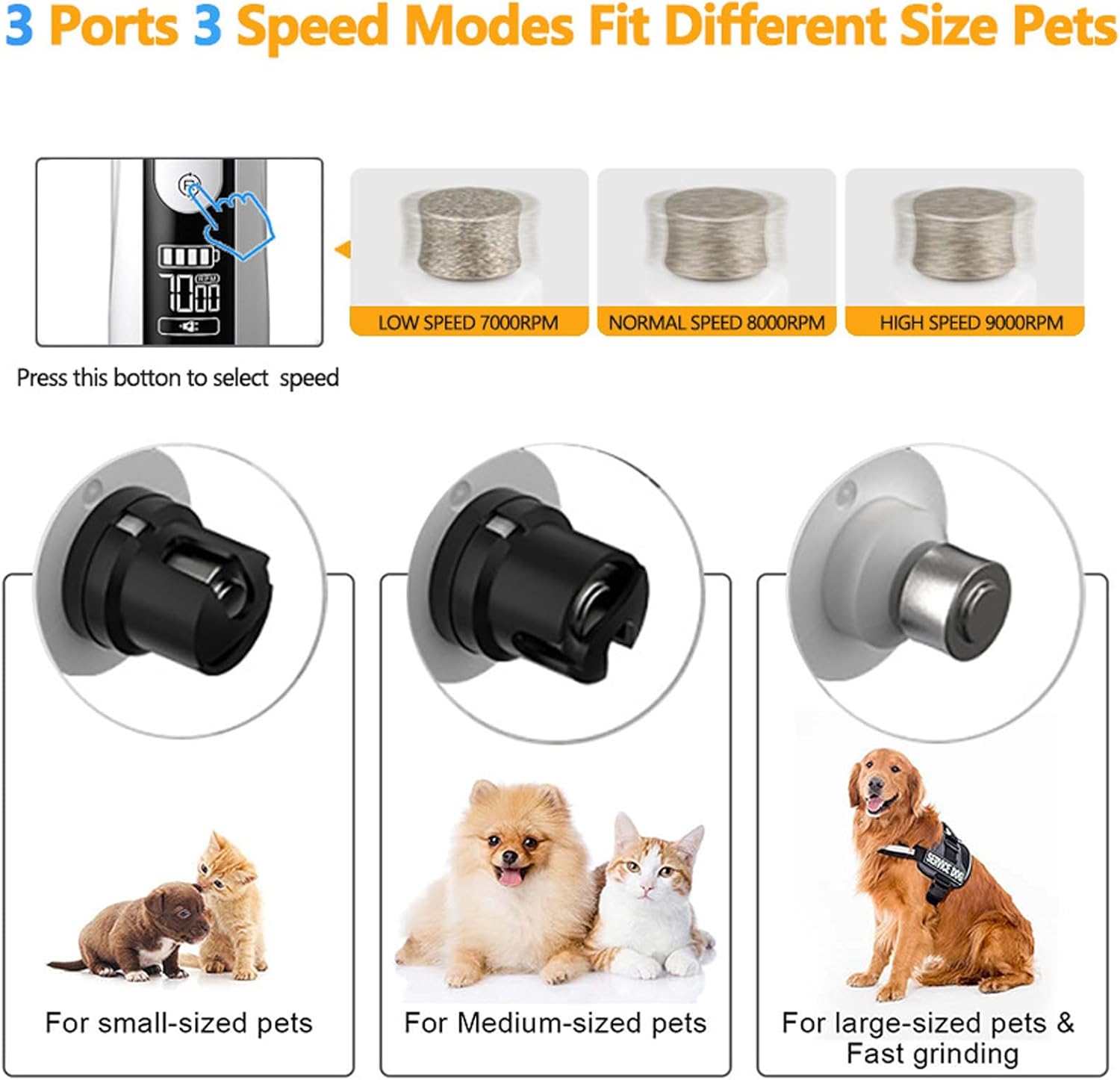 - 【Professional-Grade 3-Speed Control】Offers precise adjustment with Low (7000 RPM), Medium (8000 RPM), and High (9000 RPM) speed settings. Effortlessly tailor the power to your pet's size, nail thickness, and sensitivity for the most comfortable and efficient grooming experience.
